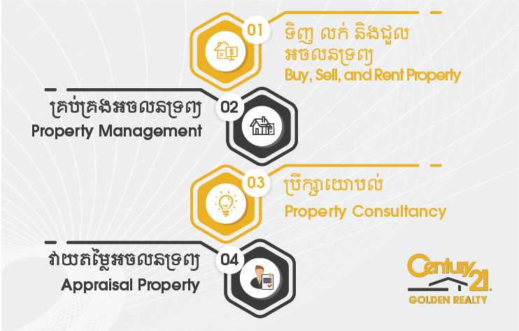 Century 21 Golden Realty Co., Ltd is operated under the licensed of Century 21 Franchise as well as a licensed from Ministry of Commerce Co, 3893 KH/2015 and Ministry of Economy and Finance E-16-215. The company has started since 2015 with our strong dynamic team that committed to deliver the best quality of real estate services. Century 21 is an international branding and leading real estate Franchise Company Since 1971 in California, USA, with over 7,700 offices worldwide in 78 countries and more than 101,000 professional sales agents.